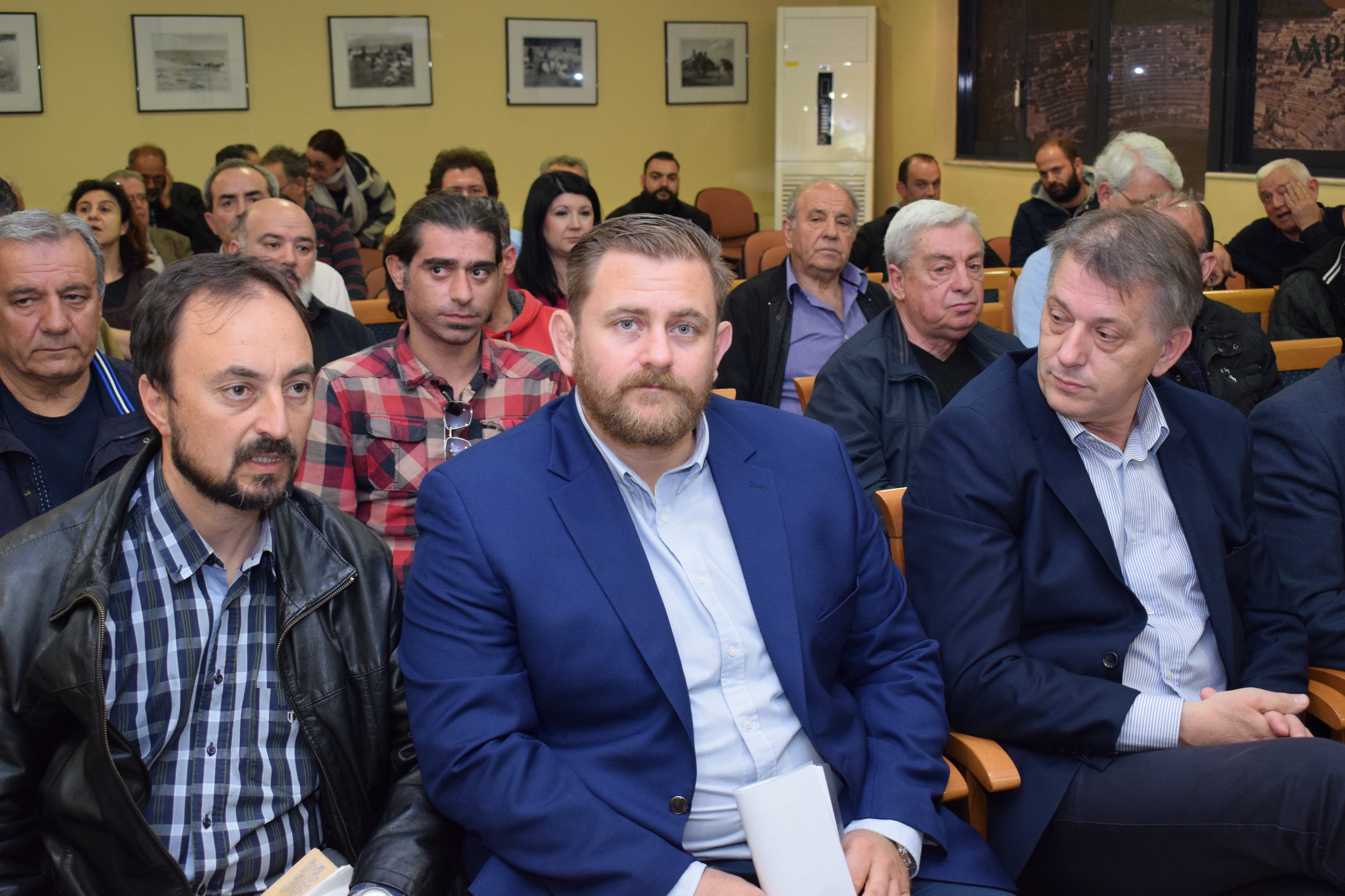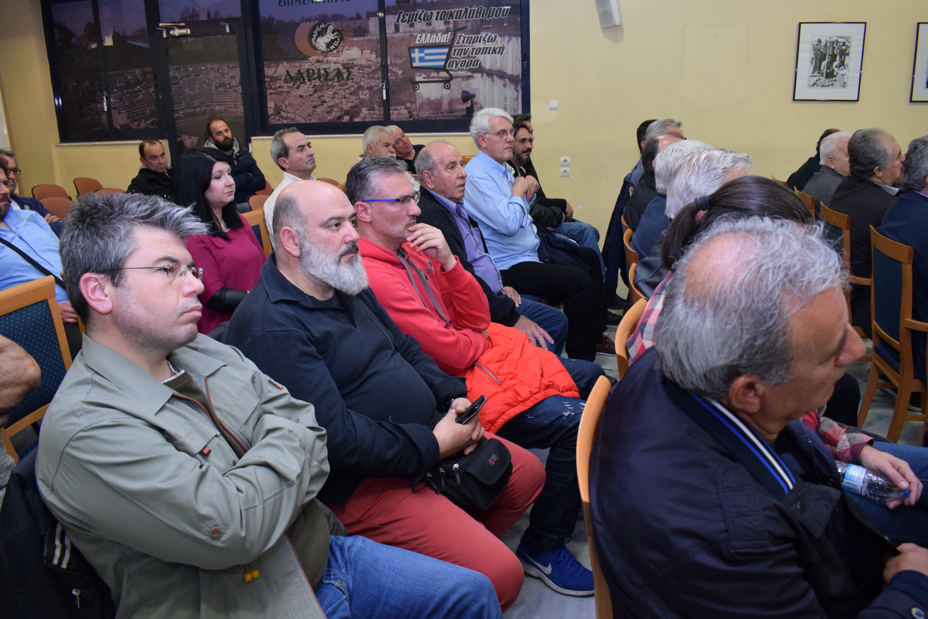 Στην εκδήλωση της ΚΟΒ ΕΒΕ χαιρετισμό έκαναν ο υποψήφιος περιφερειάρχης Θεσσαλίας, Τάσος Τσιαπλές και ο υποψήφιος δήμαρχος Λάρισας, Πέτρος Κρίκης. Στη συνέχεια έγινε η κεντρική ομιλία από τον Θανάση Τζίμα.