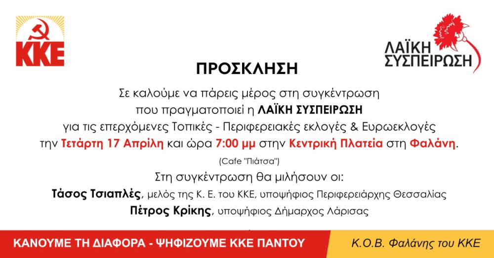 Σε καλούμε να πάρεις μέρος στη συγκέντρωση που πραγματοποιεί η ΛΑΪΚΗ ΣΥΣΠΕΙΡΩΣΗ