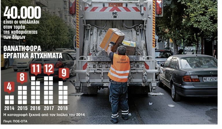 Στο μεταξύ, οι εργαζόμενοι στους ΟΤΑ θρηνούν περισσότερους από 60 συναδέλφους τους που έχασαν τη ζωή τους στο μεροκάματο τα τελευταία 8 χρόνια (!), ένας τραγικός απολογισμός, κι αυτός σύμφωνα μόνο με τις καταγραφές από μέσα μαζικής ενημέρωσης, χώρια δηλαδή από όσα κουκουλώνονται. Πολλαπλάσιος είναι ο αριθμός των εργαζομένων που έχουν σακατευτεί από σοβαρά «ατυχήματα» ή έχουν άλλους ελαφρότερους τραυματισμούς. «Ατυχήματα», θανατηφόρα και μη, συμβαίνουν με μεγάλη συχνότητα στις υπηρεσίες καθαριότητας, συνήθως αφορούν συνοδούς απορριμματοφόρου και πολλοί από αυτούς είναι συμβασιούχοι.